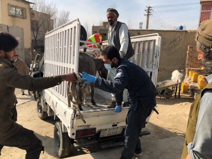 Photo: (Credit Nowzad) Nowzad Vet loading donkey onto trailer for treatment at Nowzad Clinic.