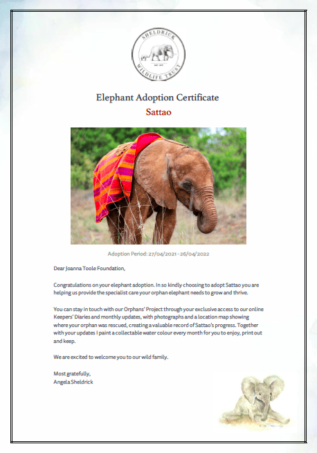 The Joanna Toole Foundation has honoured Jo’s adoption in 2018 and continued to adopt Sattao on her behalf. We hope that this helps the Sheldrick Wildlife Trust continue their amazing work helping him and many other orphaned elephants.